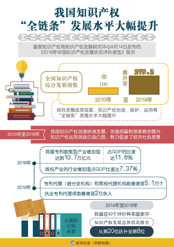 ——在完善法律法规方面,基本建立起符合国际通行规则、门类较为齐全的知识产权法律制度,实现了专利、商标、地理标志等知识产权的全方位、立体化保护。加入世贸组织以来,中国先后多次修订专利法、商标法和著作权法等法律,基本形成了知识产权“严保护”的法律制度体系。