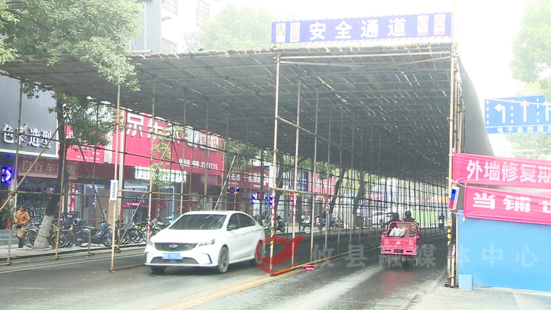 在路口记者看到,数十米长的防护棚横在道路中间,往来车辆只能通过预留的通道通行。同时,现场也伴随着“隆隆”的机器作业声,施工工人们正在紧张地修复残损居民楼墙皮。