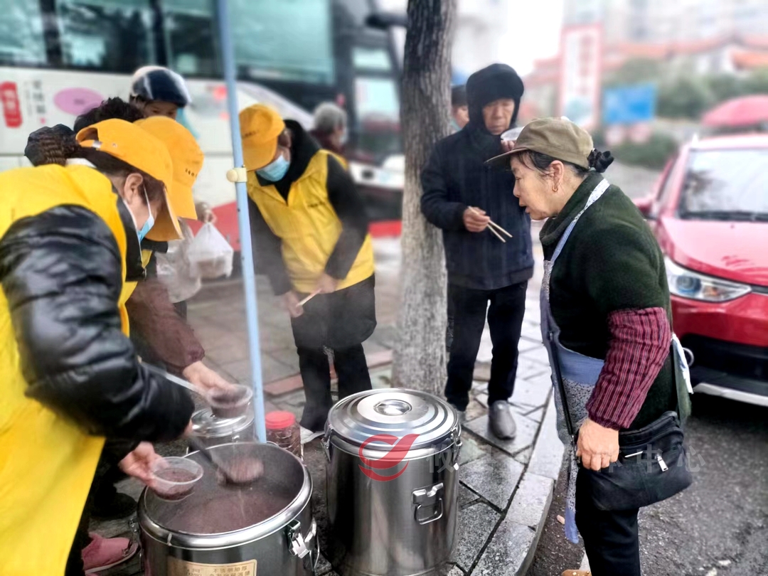 今天一大早,志愿者们冒着严寒来到活动现场,将熬了几个小时的腊八粥盛了满满6大保温桶,送到湘东大市场和人民医院门口等环卫工人工作的地点和市民比较多的地段。活动中,志愿者们将一碗碗热气腾腾的腊八粥送给环卫工人和路过的市民们,让他们感受到了浓浓的关爱和真挚的节日问候。
