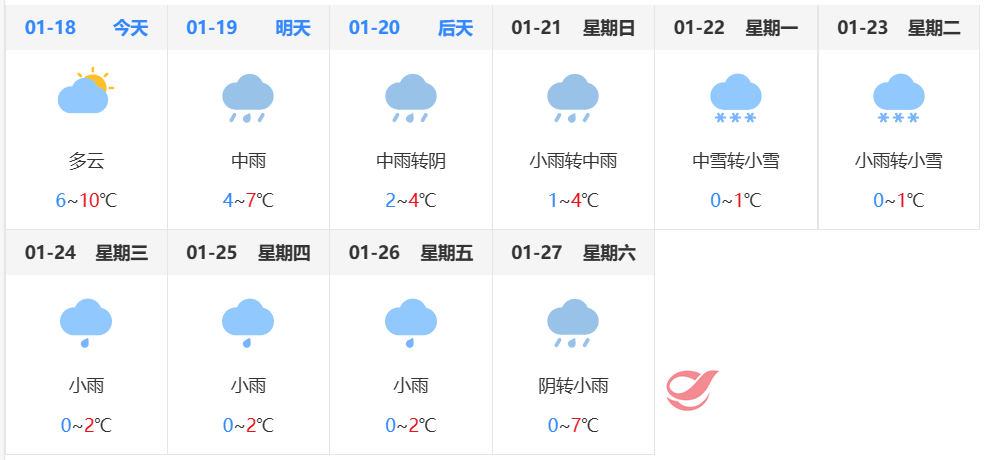 气象局工作人员李源:“未来一周我县天气以小雨转中雨为主,可能会出现雨夹雪,21号以小雨转雨夹雪为主,22号将出现中雪,23号将会从雪转为晴天。”