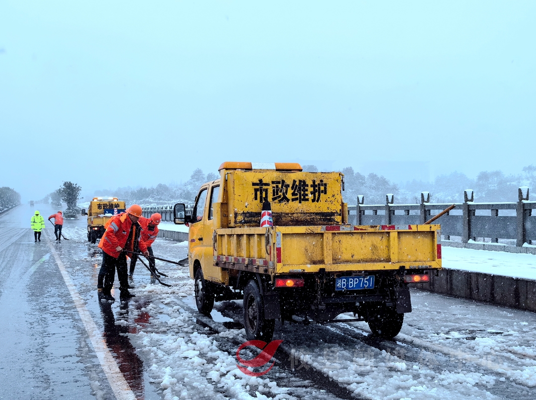 县城市管理和综合执法局市政设施现场负责人吴雄:“在紫云桥,我们在9:30发现情况,9:40到达现场,然后我们的两台市政设施的车带着工业盐到达现场,进行融冰和破冰处理、人工铲除,大约一个半小时后,路面全部清理干净。”