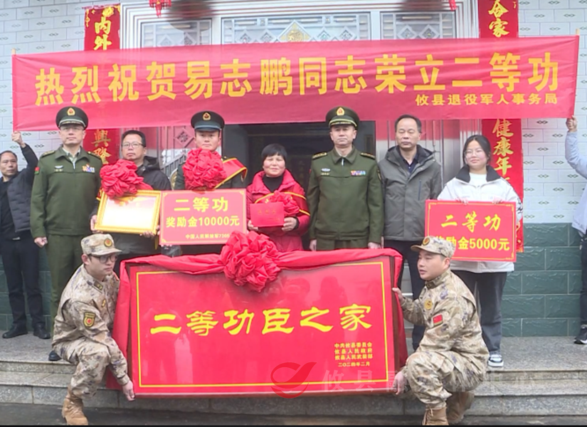 当天上午,乡亲们从四面八方赶来庆祝,簇拥在易志鹏家人旁边鼓掌喝彩,共享荣光时刻。在乡亲们的见证下,县人武部、县退役军人事务局工作人员为其家属佩戴了“一人立功,全家光荣”的绶带和红花,并送上慰问金和立功喜报,宣读了易志鹏的立功事迹。