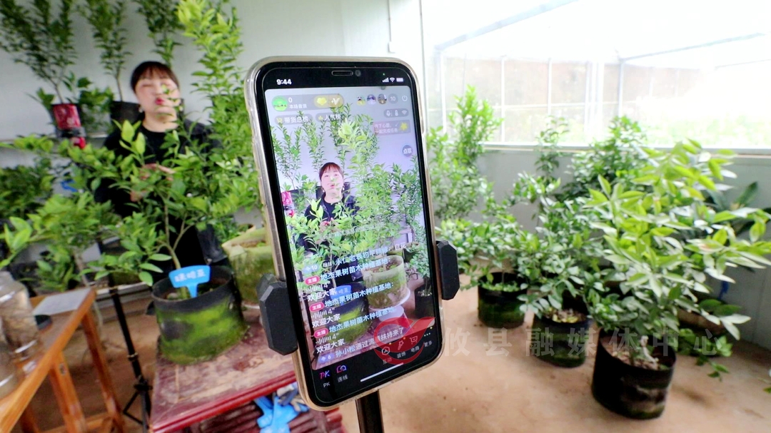 在株洲地杰现代农业有限责任公司苗木培育基地,带货主播正对着手机镜头介绍各种柑橘苗木。