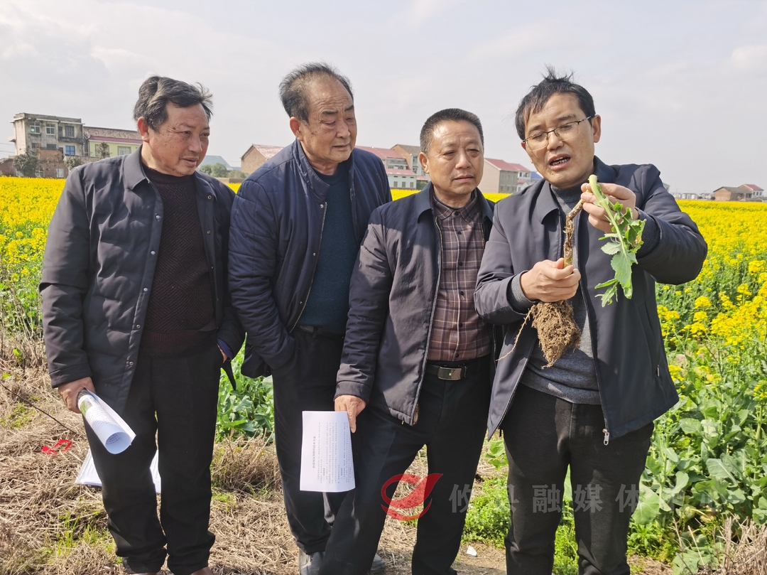在新市镇福寿湾村的油菜种植基地,县农技人员正带领油菜种植大户在油菜地查看生长情况,现场讲解油菜病虫害综合防控技术。