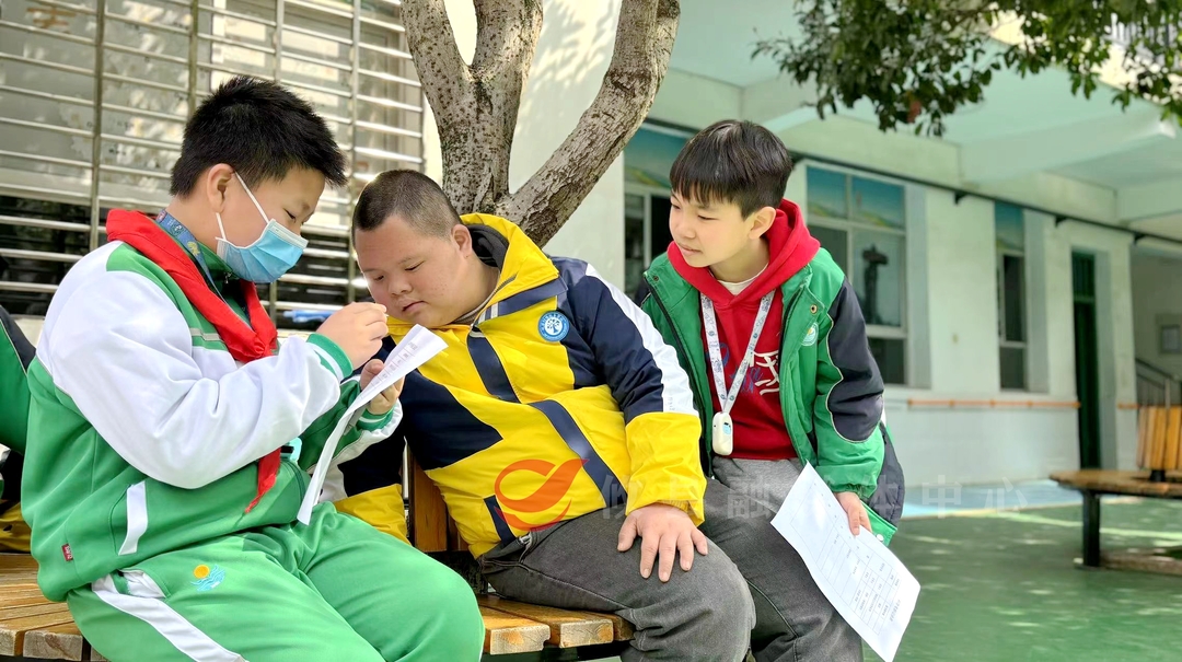 展示环节之后,学生们两人一组,给特校学生分享自己的科技作品、科普画、环创作品。来自健坤外国语学校的黄子龙带来了遥控飞机,他现场手把手教特校学生操作遥控飞机,零距离体验科学的魅力。