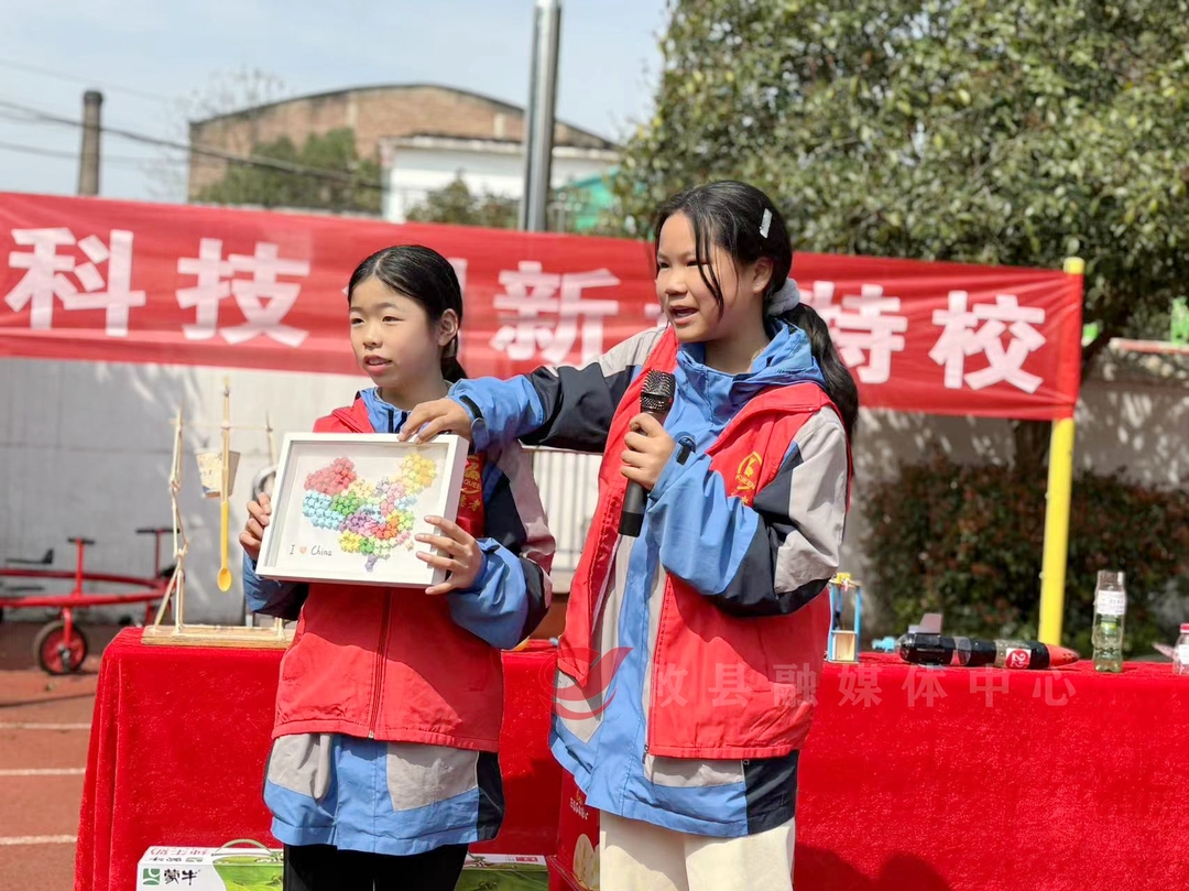 在学校操场上,来自东北街小学、健坤外国语学校的学生们精心准备了自己创作的科技作品,并耐心地给特校学生讲解每一个作品的制作过程、科学原理。
