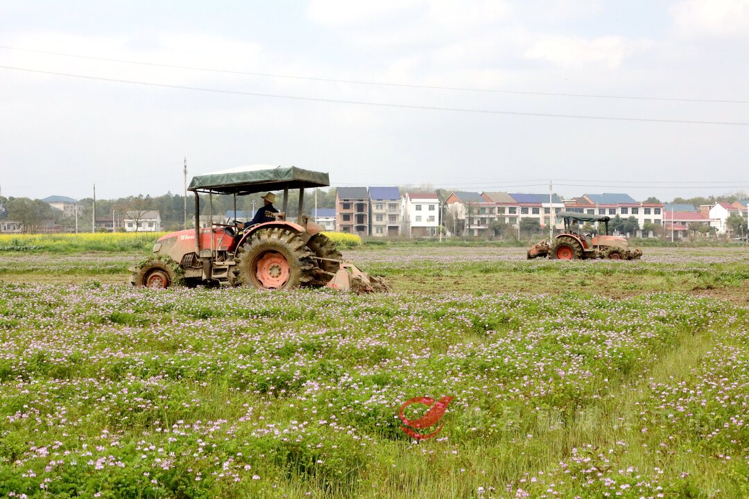 在新市镇的一片种满紫云英的农田里,翻耕机来回穿梭,所过之处,紫云英被碾碎压进田里化作了春泥,为接下来的水稻种植提前培肥土壤。