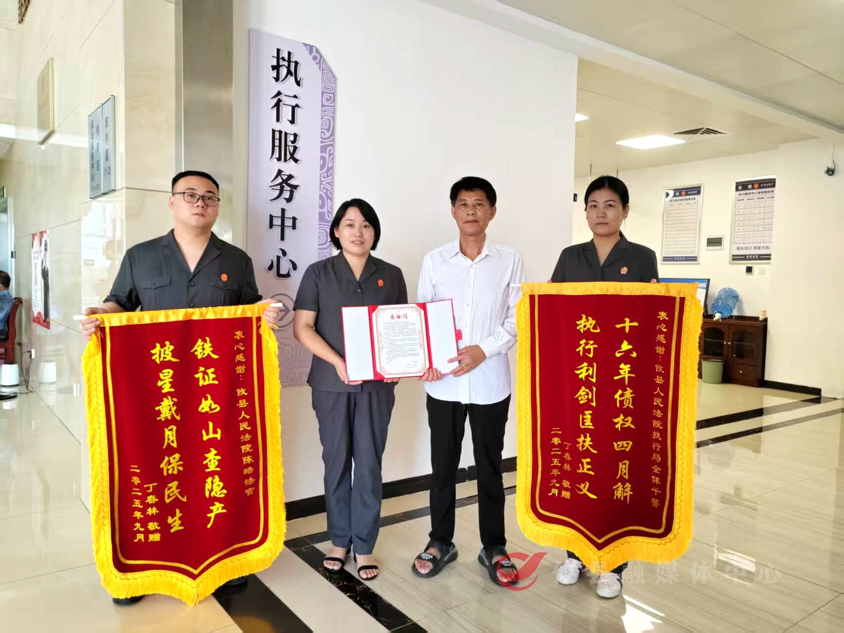 16年的欠款纠纷,终划上了圆满的句号。9月5日,在攸县人民法院执行服务中心,当事人老丁将两面锦旗、一封感谢信送到攸县人民法院执行局负责人与执行法官手中,对执行团队倾力维护其合法权益表达诚挚谢意。