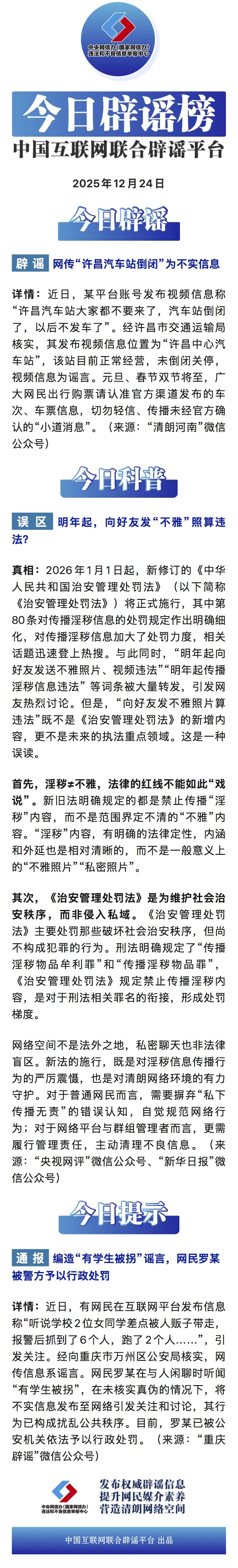 编造“学生被拐”谣言者被依法处罚——今日辟谣(2025年12月24日)