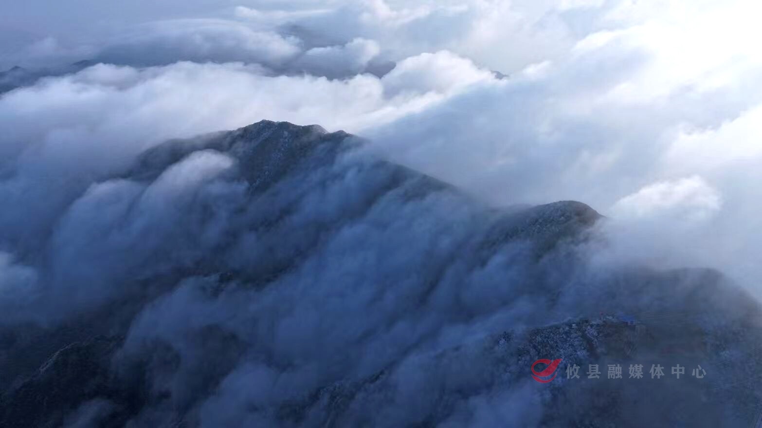 随着冷空气深入,太和仙山顶气温降至冰点,为雾凇的形成创造了条件,与此同时,山间充足的水汽在低温下凝结,形成了浩瀚的云海。从航拍画面可见,翻腾的云海绵延于群山之间,初升的朝阳将云层与晶莹的雾凇染上金边,山脊在云海中若隐若现,漫山的树木挂满晶莹剔透的雾凇,如披银纱、似缀玉珠,景象极为震撼。