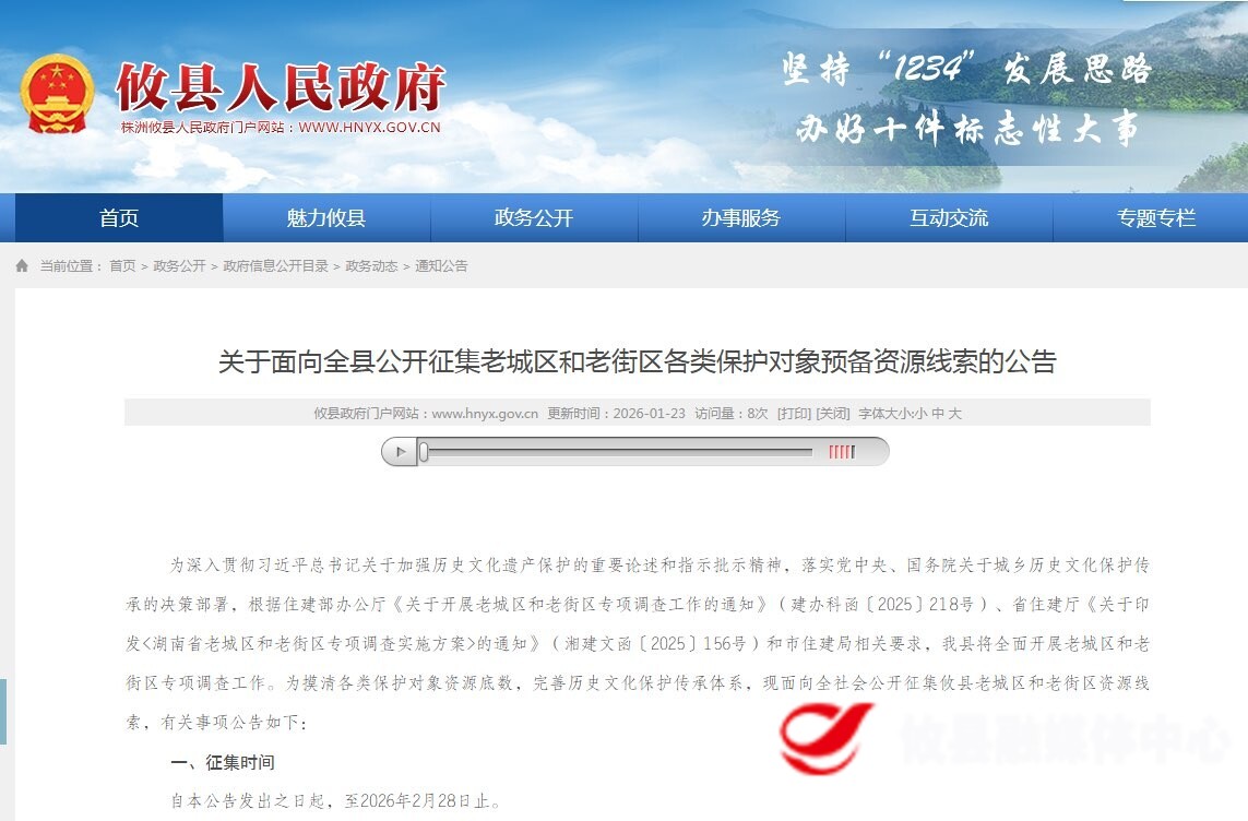为深入贯彻习近平总书记关于加强历史文化遗产保护的重要论述和指示批示精神,落实党中央、国务院关于城乡历史文化保护传承的决策部署,根据住建部办公厅《关于开展老城区和老街区专项调查工作的通知》(建办科函〔2025〕218号)、省住建厅《关于印发<湖南省老城区和老街区专项调查实施方案>的通知》(湘建文函〔2025〕156号)和市住建局相关要求,我县将全面开展老城区和老街区专项调查工作。为摸清各类保护对象资源底数,完善历史文化保护传承体系,现面向全社会公开征集攸县老城区和老街区资源线索,有关事项公告如下: