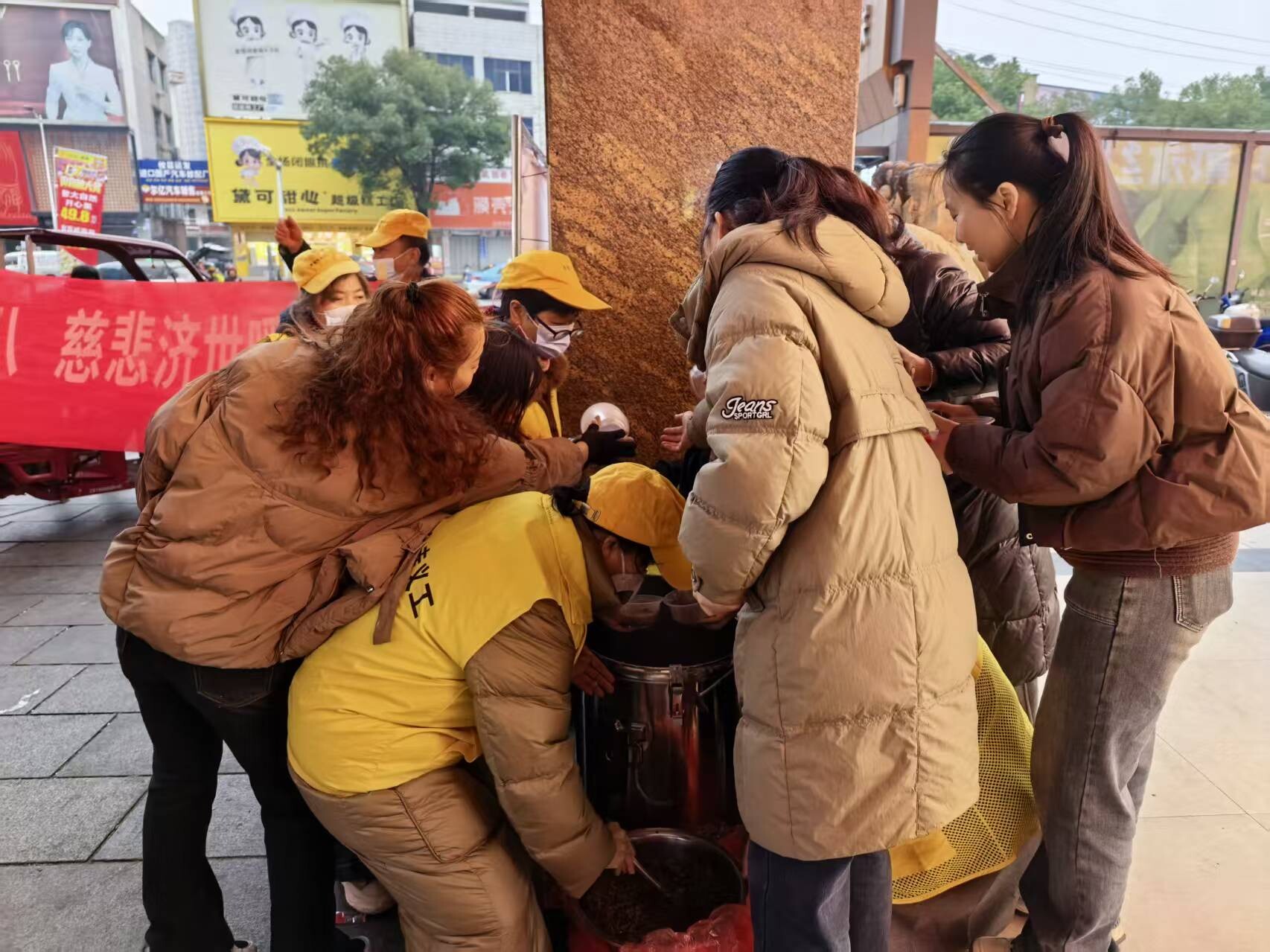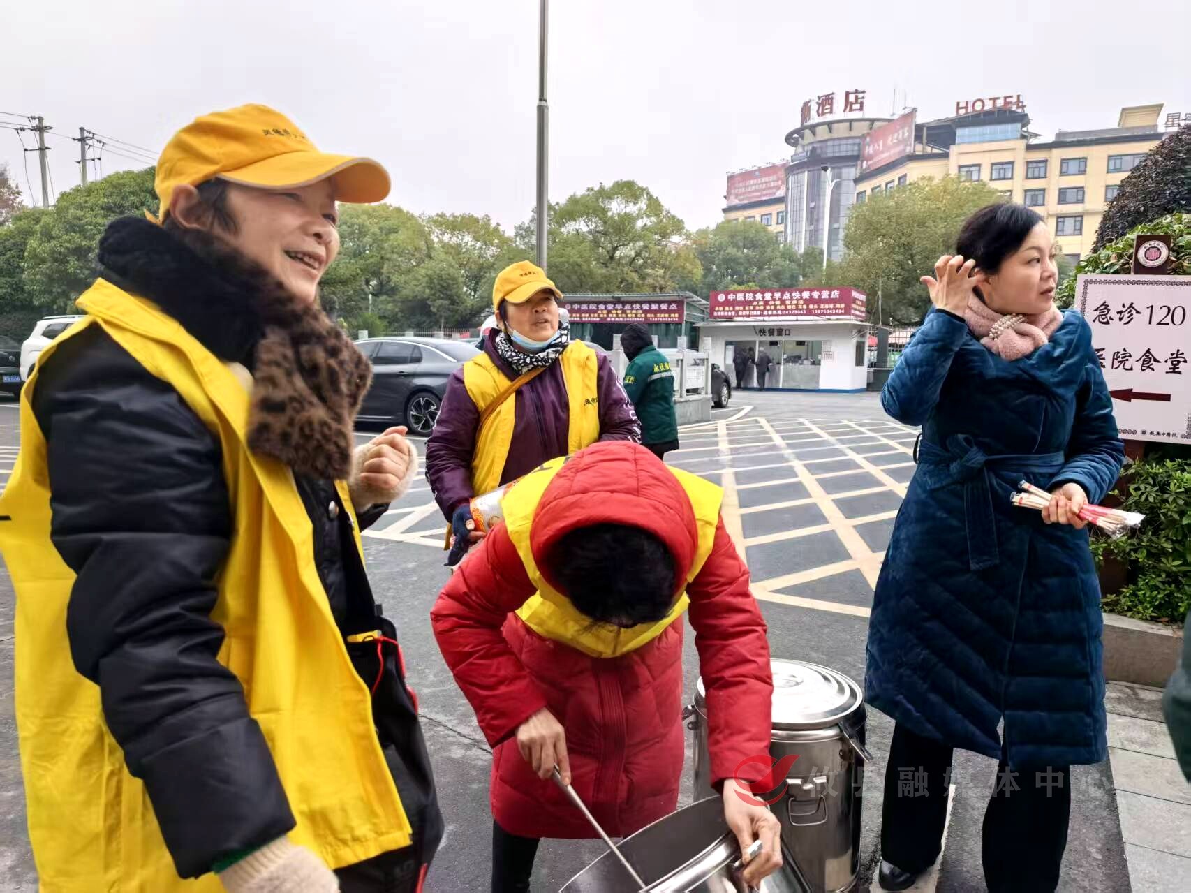 早上7点,志愿者们就冒着严寒来到活动现场,将熬了一晚上的腊八粥盛了满满9大保温桶,送到人流密集的湘东大市场和人民医院门口。活动中,志愿者们将一碗碗热气腾腾的腊八粥送到正在打扫卫生的环卫工人和路过的市民手上,让他们感受到了浓浓的关爱和诚挚的节日问候。
