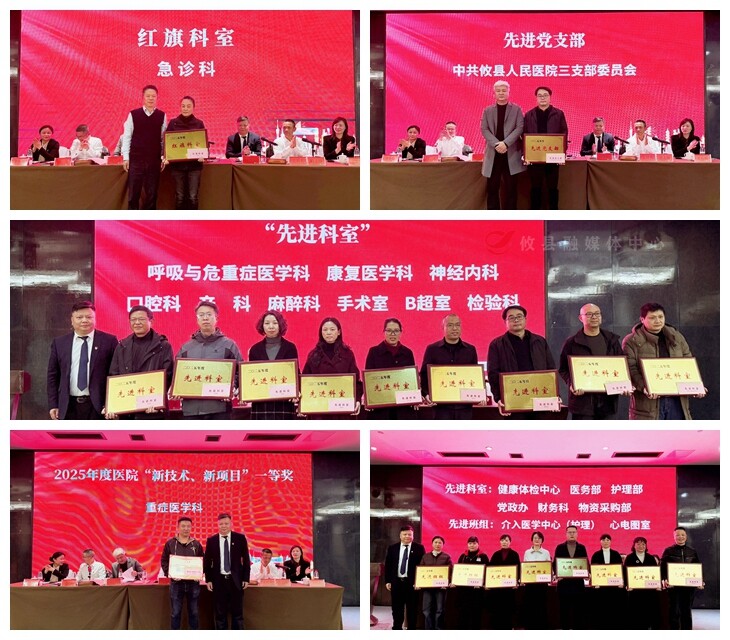 在随后的表彰环节中,大会对多个领域表现优异的集体进行了颁奖。获奖科室涵盖“新技术新项目”“平安医院建设”“学科能力建设”“优质服务”等十余个类别。获奖代表依次登台领奖,现场气氛掌声不断,气氛热烈。各科室负责人还向医院党委递交了新一年的工作目标责任状,进一步压实了工作责任。县卫健局主要负责人出席大会并讲话,对医院过去一年的工作成绩给予充分肯定,并对下一步发展提出明确要求,希望全院上下继续团结奋进,为全县卫生健康事业作出更大贡献。