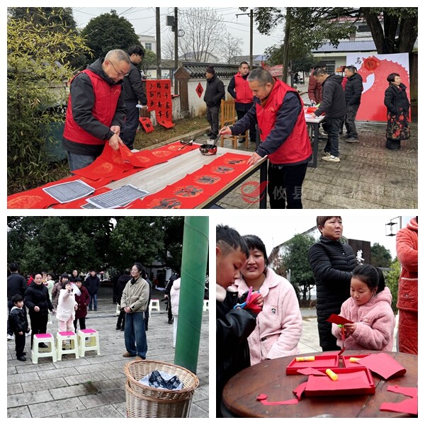 活动在精彩的文艺表演中拉开序幕。菜塘村曹坊舞蹈队带来的舞蹈《福满农家》舞出了农家丰收的喜悦;村民深情演唱的《我的中国心》等歌曲,唱响了家国情怀;村民自编自演的情景表演,生动宣传了党的二十届四中全会精神;高和姐妹花广场舞队、弄塘舞蹈队等接连献上《花开中国》《江南夜雨十年灯》等优美舞蹈,展现了村民积极向上的精神风貌;整场表演贴近生活、内容丰富,赢得了观众的阵阵掌声。随后的游戏互动环节更是热闹非凡。现场设置了“写春联、赠春联”“拍全家福”“剪窗花”“投壶纳福”等趣味活动。现场欢声笑语不断,还能获新春小礼品,整个广场成为了欢乐的海洋,浓浓的年味弥漫在每个角落。