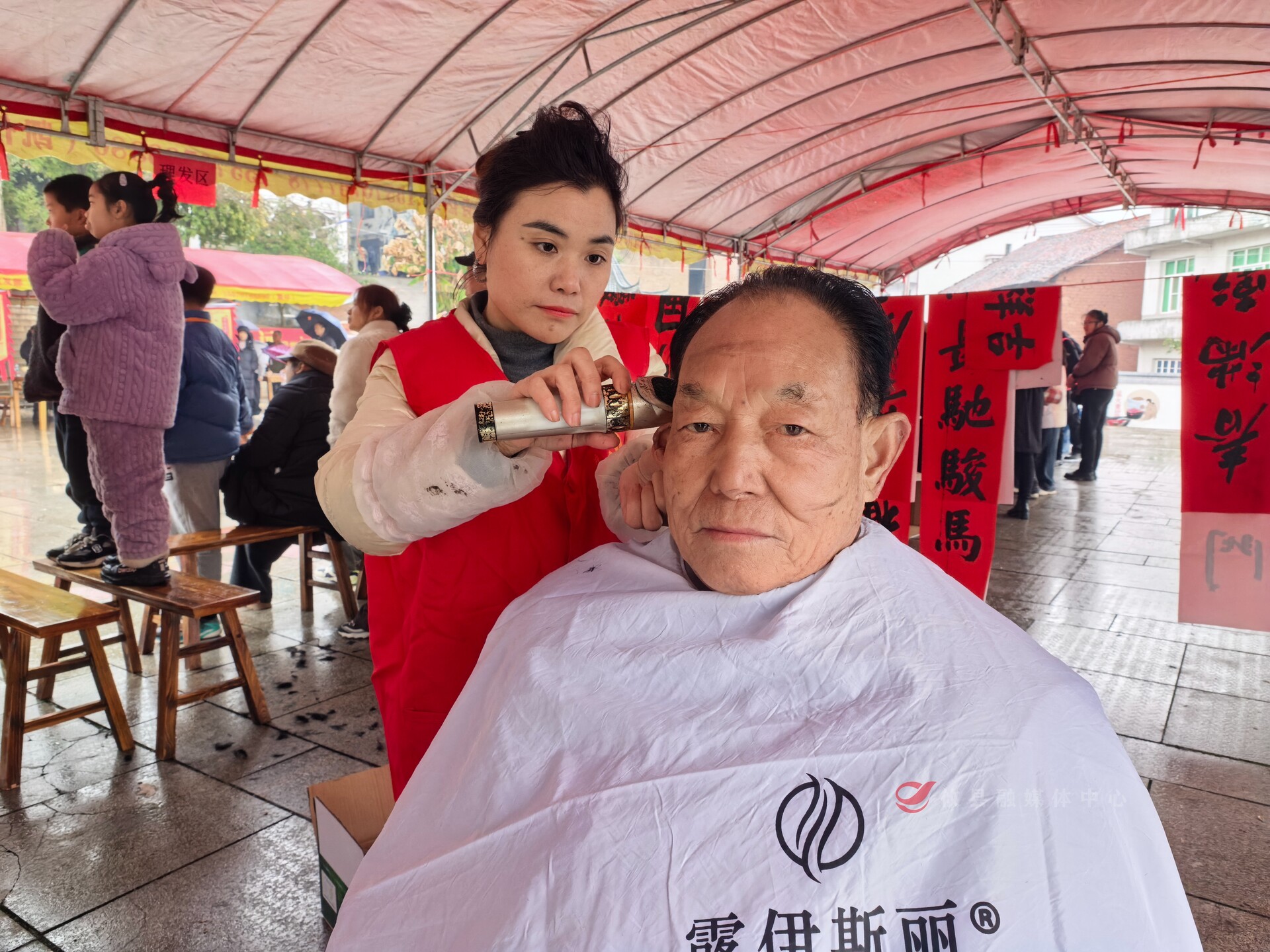 在送春联的对面,巾帼志愿服务队的专业理发师已早早携带全套工具来到这里,她们根据每位老人的发型需求,一边娴熟地修剪头发,一边与老人们亲切唠家常,现场欢声笑语不断。