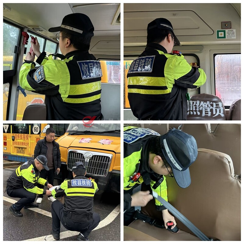 检查现场,交警逐一对校车进行全方位安全 “体检”。重点检查校车轮胎、车内监控、安全带、灭火器、安全锤等设施是否完好可用,急救箱药品是否配备齐全。同时,严格核查校车手续资质、安全运行条件、日常维护保养记录及驾驶员从业资格等情况,从源头排查安全隐患,坚决防范交通事故发生,全力保障广大学生乘车出行安全。