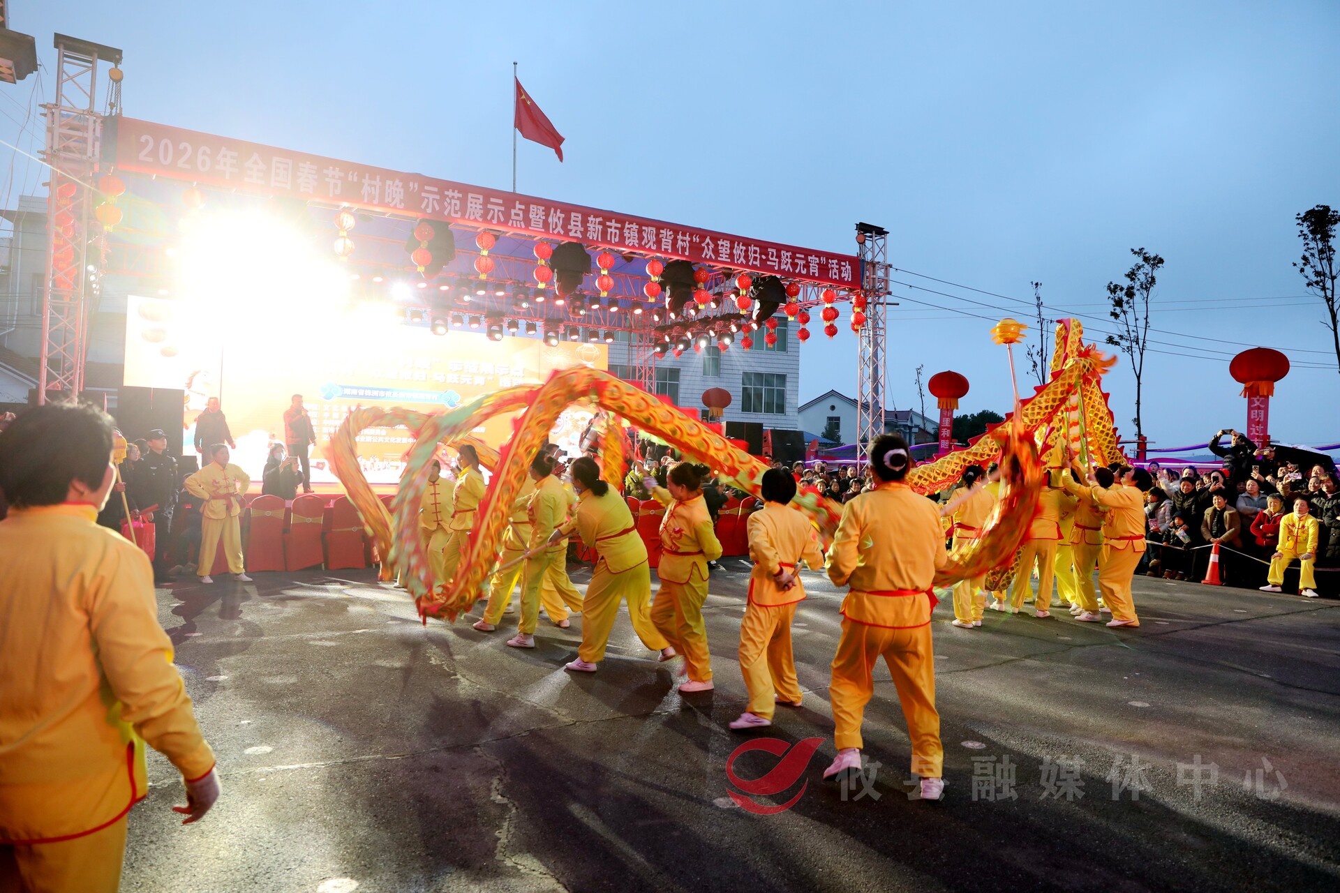 活动现场热闹非凡,一场独具特色的龙灯巡游拉开了元宵村晚的序幕。观背村舞龙队、工作人员与志愿者从村口举龙灯、提灯笼巡游入场,锣鼓队的铿锵鼓点与舞龙表演完美配合,舞龙队随着鼓点接连舞出了“龙腾马跃”“双龙戏珠”“龙游四海” 等经典造型,龙身随音乐节奏灵动穿梭、气势如虹。