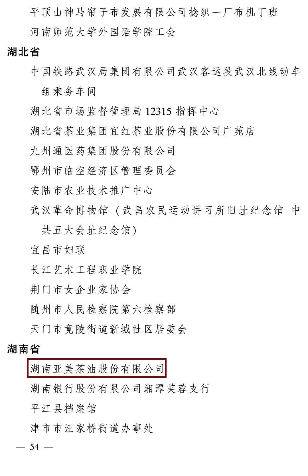 为表彰先进、树立榜样, 充分发挥先进典型和模范人物示范作用, 全国妇联决定, 授予兰臻等9人全国三八红旗手标兵称号, 授予阮祥燕等598人全国三八红旗手称号, 授予中国人民抗日战争纪念馆社会教育部等400个单位全国三八红旗集体称号,授予首都医科大学附属北京同仁医院耳鼻咽喉头颈外科等 600 个单位全国巾帼文明岗称号。其中湖南亚美茶油股份有限公司荣获"全国三八红旗集体"称号!