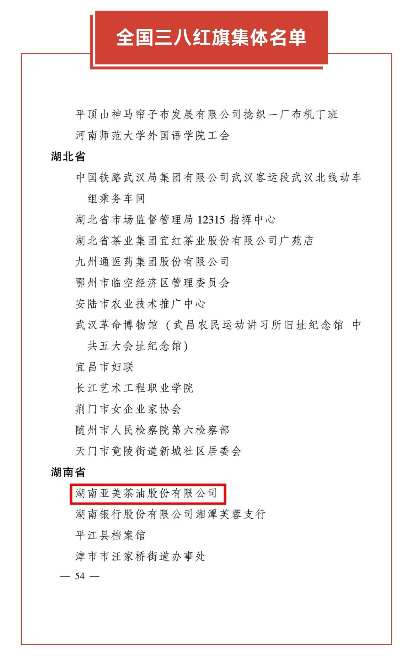 3月2日,纪念三八国际妇女节暨表彰大会在京举行,大会表彰了全国三八红旗手标兵、全国三八红旗手、全国三八红旗集体、全国巾帼文明岗等先进个人和集体。其中,攸县高新区企业——湖南亚美茶油股份有限公司获评全国三八红旗集体荣誉称号,这也是攸县以及株洲市唯一获此殊荣的企业。