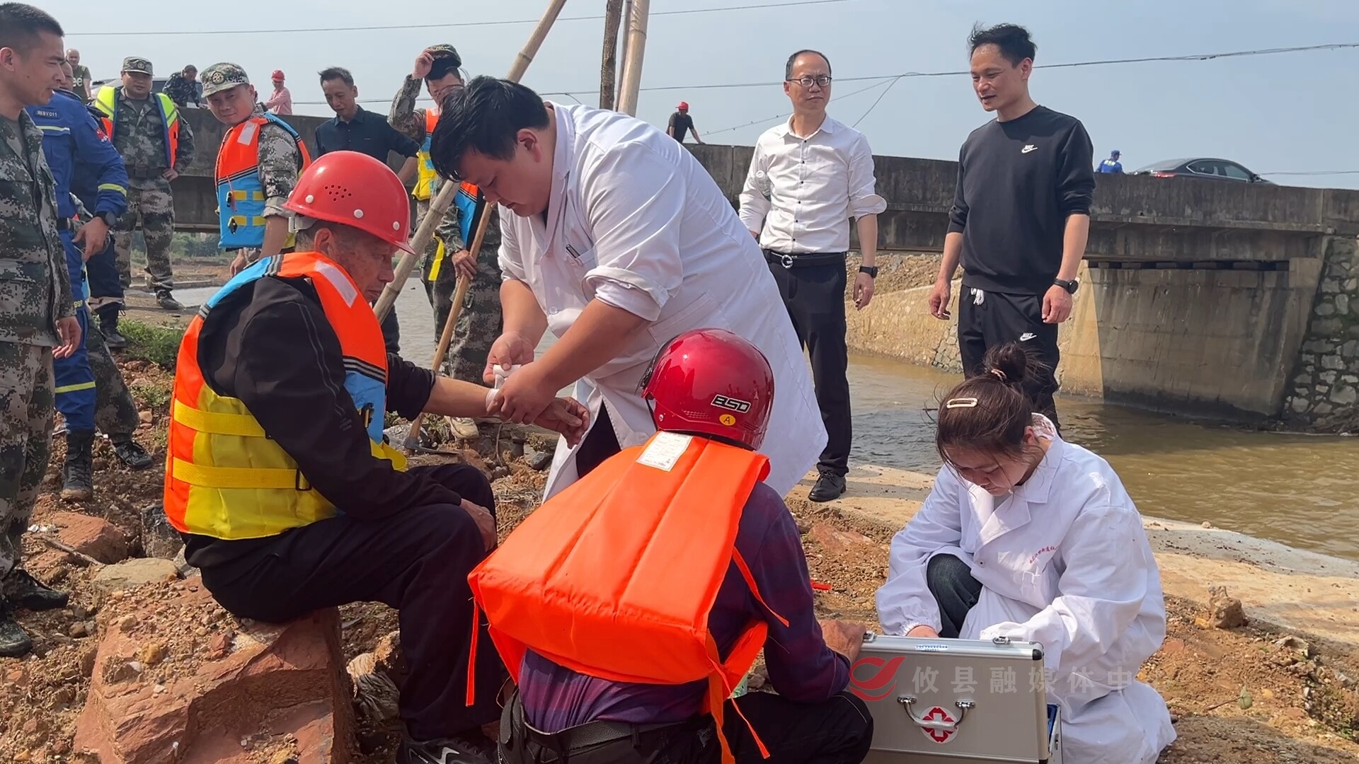 在堤坝渗漏处置现场,抢险队员迅速排查险情,对渗漏点进行封堵加固,装填沙袋、分层堆砌并压实稳固,快速有效地控制了险情,确保了堤坝安全。在群众转移区域,基干民兵与工作人员分工协作,引导群众快速、有序地撤离至安全安置点,做到不漏一户、不落一人。在水域搜救现场,救援队员驾驶冲锋舟靠近“被困人员”,利用救生器材精准施救,迅速将群众转移至安全地带。医疗救护组同步跟进,对“受伤人员”进行止血、包扎、转运等紧急救治,全流程衔接顺畅、处置规范。
