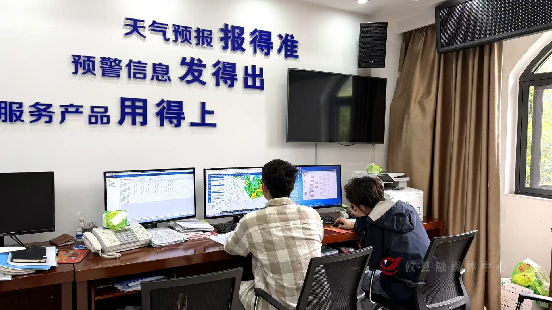 在县气象局的监测中心,工作人员正密切关注天气变化。