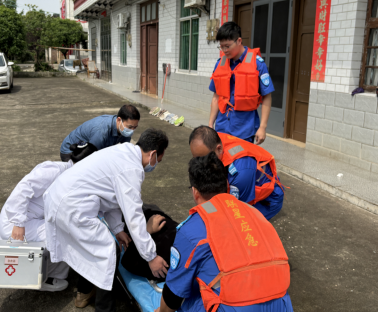 演练现场,随着险情预警信号发出,各工作组迅速响应、高效联动:应急抢险组第一时间装填沙袋,对重点险点进行加固作业,筑牢防汛第一道防线;应急转移组逐户上门通知,引导群众沿预定路线有序撤离,重点帮扶老人、行动不便人员安全转移至“人员转移安置点”;医疗救护组同步开展现场急救演练,模拟对受伤群众进行紧急处置和转运,确保“伤员”得到及时救治;水上救援组利用冲锋舟开展受困人员救援实操演练,规范完成人员登船、转移等关键流程;安置保障组在安置点完成群众登记、秩序维护,并同步开展防灾避险知识宣讲,进一步提升群众的自救互救意识。整个演练过程紧张有序、衔接顺畅,各环节响应迅速、处置规范,充分展现了各部门协同作战的实战能力。